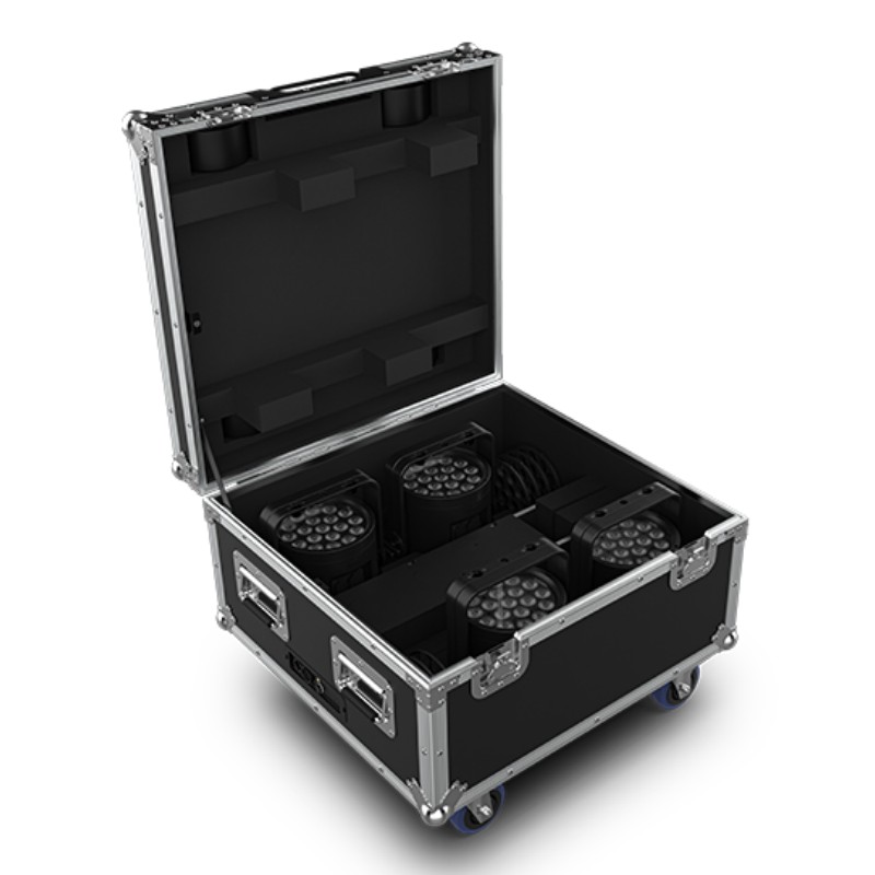 A fully realized kit of (4) Battery operated black IP65 rated par style fixture with (19) RGB Warm White LEDs and a beam angle of 12.7 degrees