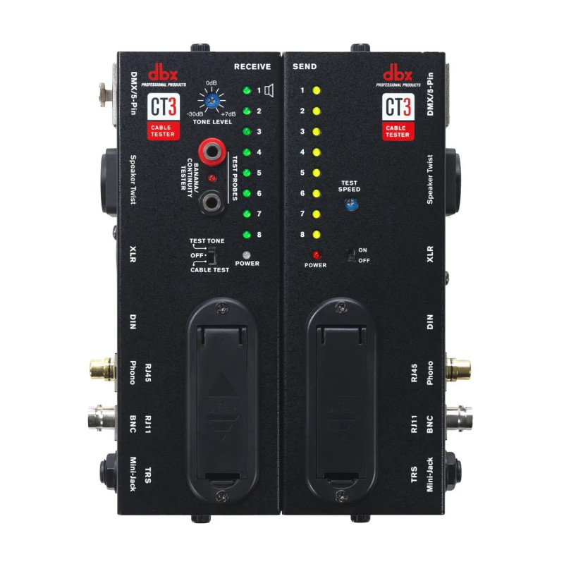 dbx CT-3 δοκιμαστής καλωδίων όπου χωρίζεται σε 2 τμήματα για έλεγχο προεγκατεστημένης καλωδίωσης (πομπός / δέκτης), ηχητικό & οπτικό σήμα για τους ακροδέκτες "banana" και ενδείξεις με 8 LED για έλεγχο καλωδίων και βυσμάτων έως 8 πόλων.