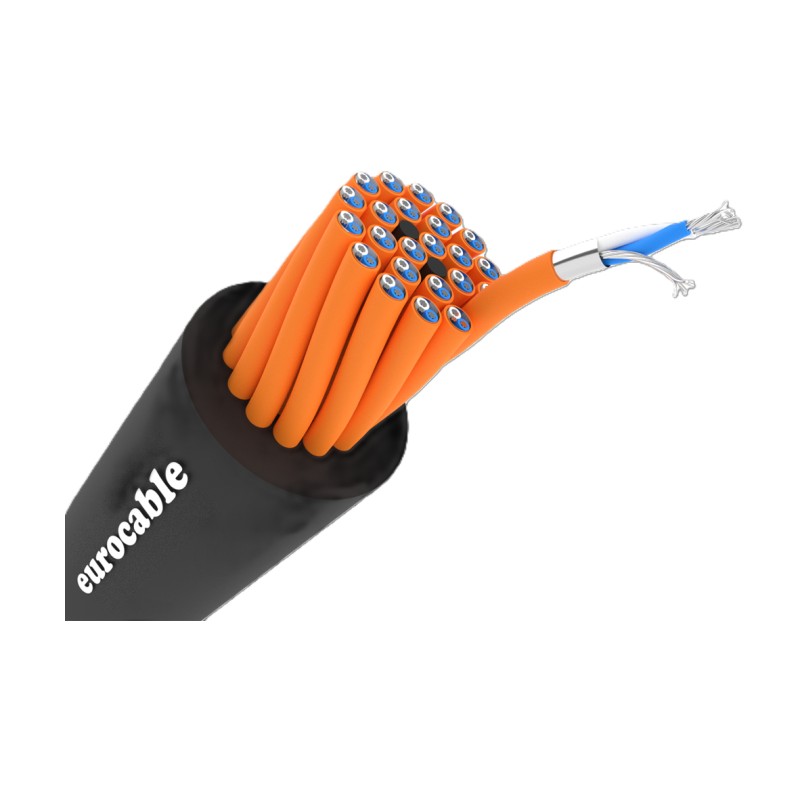Eurocable's multi-pair audio cables are designed with an aluminum shield, featuring individual pairs each enclosed in an aluminum/mylar foil shield, complemented by a drain wire to simplify installation. Each pair is not only individually shielded but also distinctly identified by numbers and letters for ease of use. The external jacket, made from extra-flexible PVC, offers excellent anti-treading and anti-abrasion properties, enhancing the cable's durability. These cables are particularly well-suited for use with HD series cable reels, which further aids in efficient handling and deployment in professional audio settings.