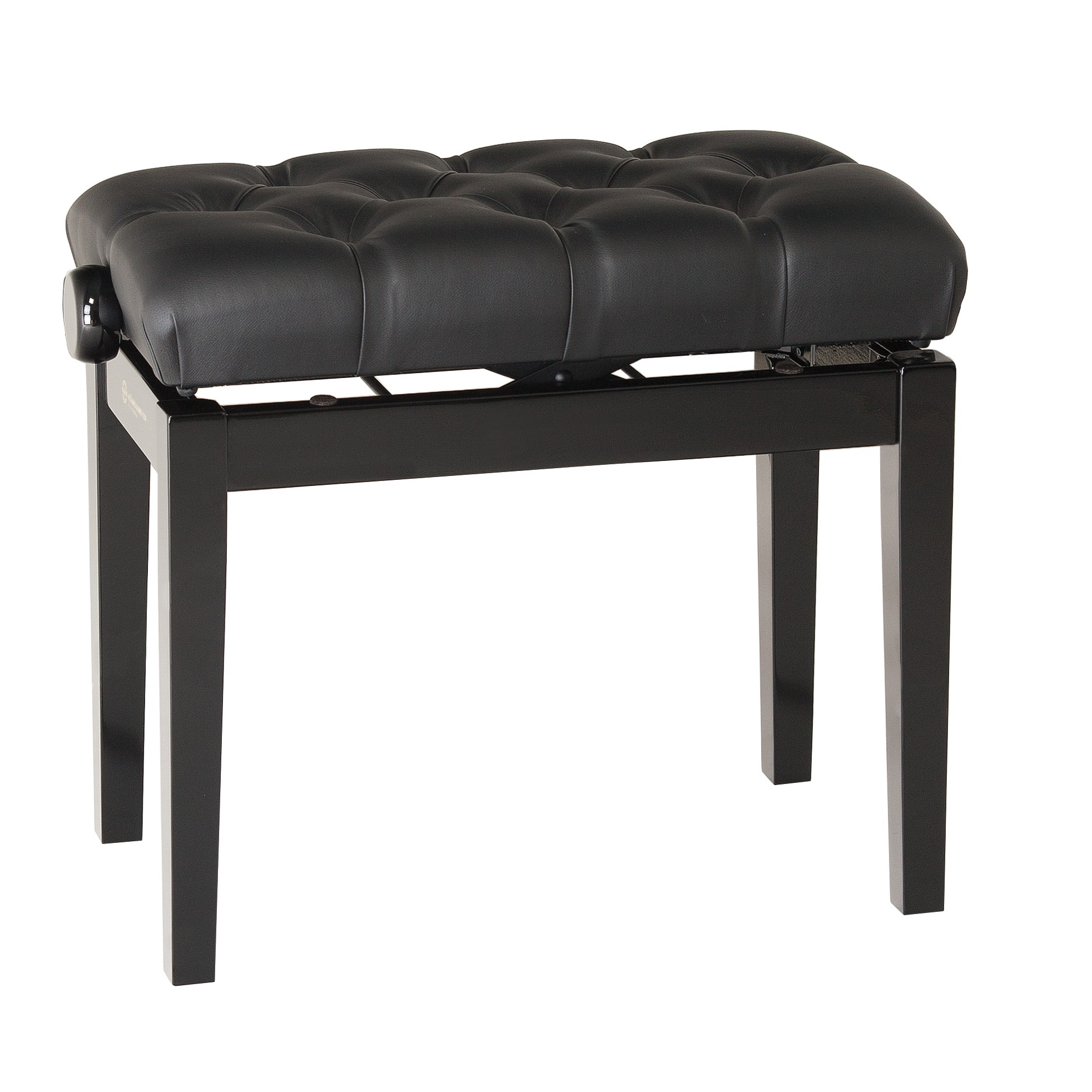 Κάθισμα για πιάνο από μασίφ ευρωπαϊκό ξύλο οξιάς, βερνικωμένο με τέσσερις στρώσεις από μαύρο πολυεστέρα. Σταθερά πόδια με αντιολισθητικό καουτσούκ. Βαρέως τύπου μαξιλάρι κατασκευασμένο από MDF με καπιτονέ μαύρο κάλυμμα από δέρμα υψηλής ποιότητας