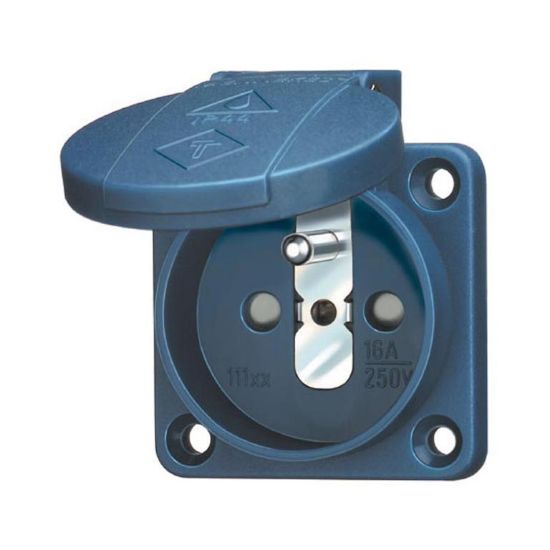Schuko 11181 θηλυκό βύσμα ρεύματος για panel. Σχεδίαση σύμφωνη με τα Γαλλικά και τα Βελγικά πρότυπα. Διαθέτει προστατευτικό κάλυμμα και υποδοχές για καλώδιο 1,5 - 2,5 mm2.