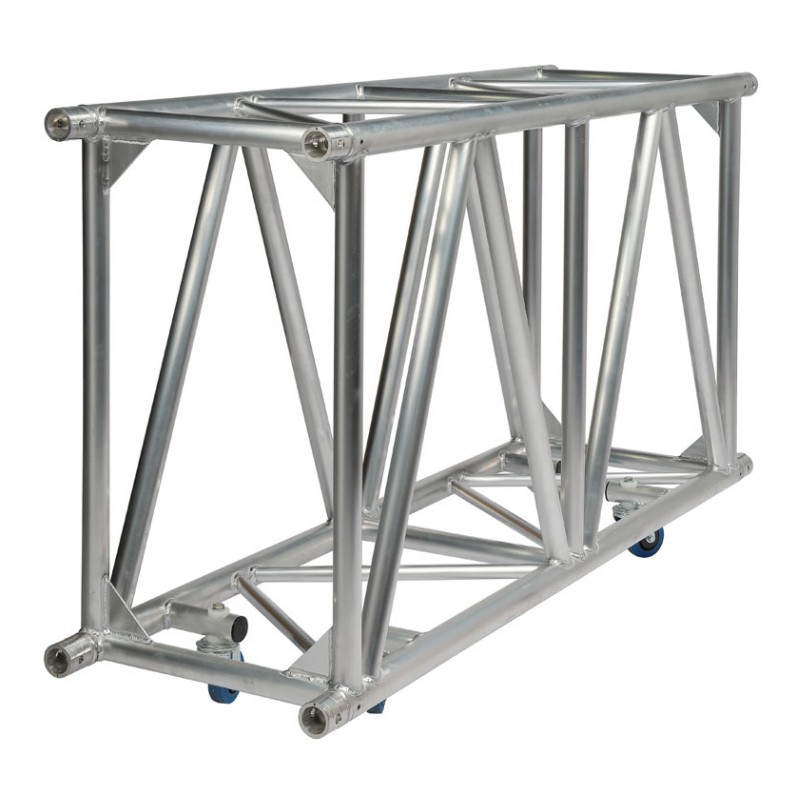 100RV Series truss is constructed of main chords (60 x 6 mm) and diagonal members (48 x 3 mm). Equipped with the CCS7 conical coupling system, the B100RV truss is fast and easy to assemble. Due to its 4-sided webbing the B100RV truss can absorb vertical as well as horizontal loads, which make sit ideal for outdoor or 3 dimensional structures. Standard equipped with a set of castors, the truss is easy to transport and stack, and clever pin orientation makes the assembly fool proof. B100RV truss is available in triangular and square profiles and a range of corners and accessories.
