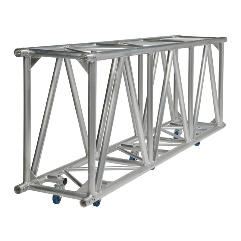 100RV Series truss is constructed of main chords (60 x 6 mm) and diagonal members (48 x 3 mm). Equipped with the CCS7 conical coupling system, the B100RV truss is fast and easy to assemble. Due to its 4-sided webbing the B100RV truss can absorb vertical as well as horizontal loads, which make sit ideal for outdoor or 3 dimensional structures. Standard equipped with a set of castors, the truss is easy to transport and stack, and clever pin orientation makes the assembly fool proof. B100RV truss is available in triangular and square profiles and a range of corners and accessories.