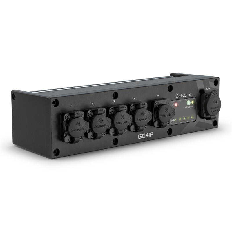 GeNetix GD4IP is a compact IP65-rated 4-port DMX Splitter that comes with multiple rigging options for easily mounting in your rig.