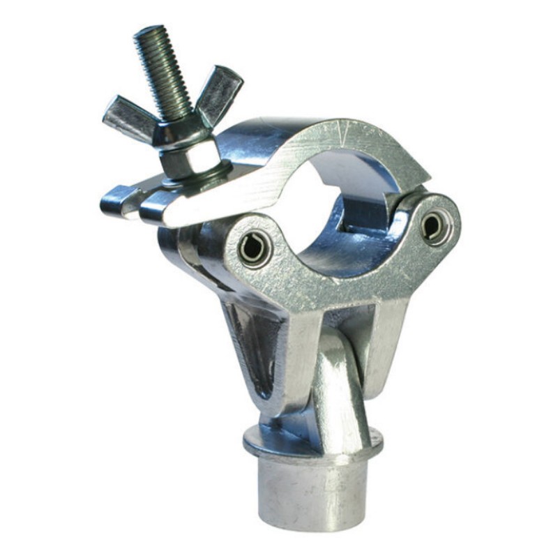 An aluminium clamp with a high tensile extruded lid that is suitable for 48mm to 51mm diameter tubes and is 50mm wide, factory fitted to a pivot plug. Provides articulation between two tubes and is ideal for use in special “one off” applications. Suitable for welding only.