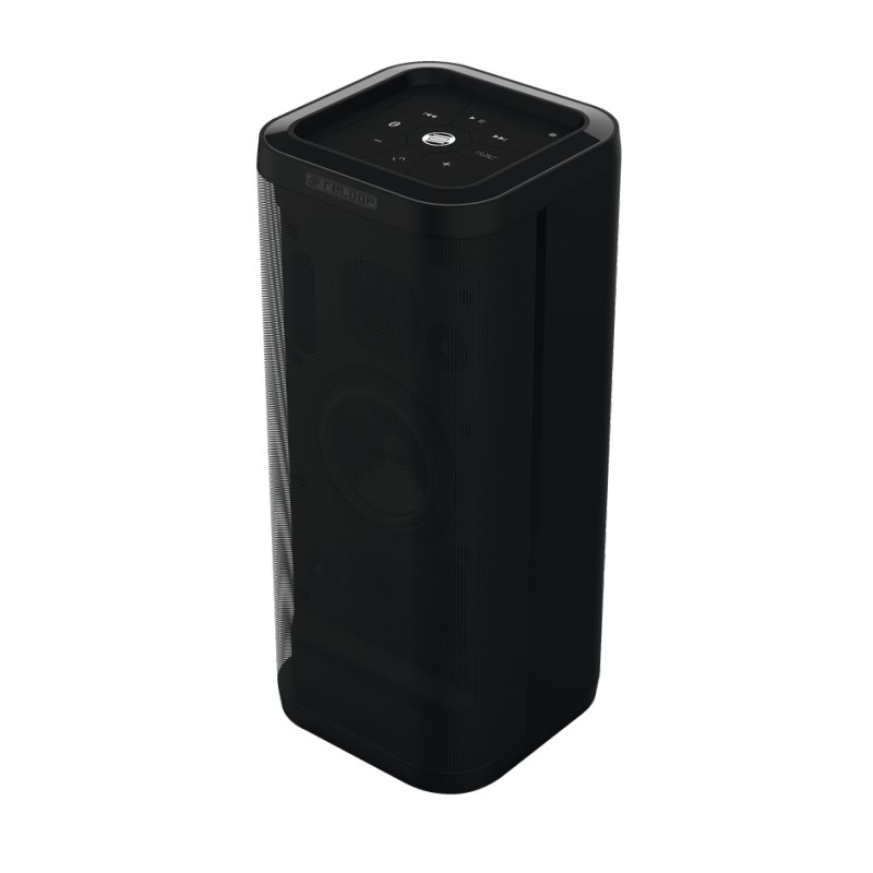 The control panel on the top of the speaker offers convinient playback features such as Play/Pause , Previous/Next Track, Volume +/- , Bluetooth Pairing, Speaker Pairing and the master On/Off switch.